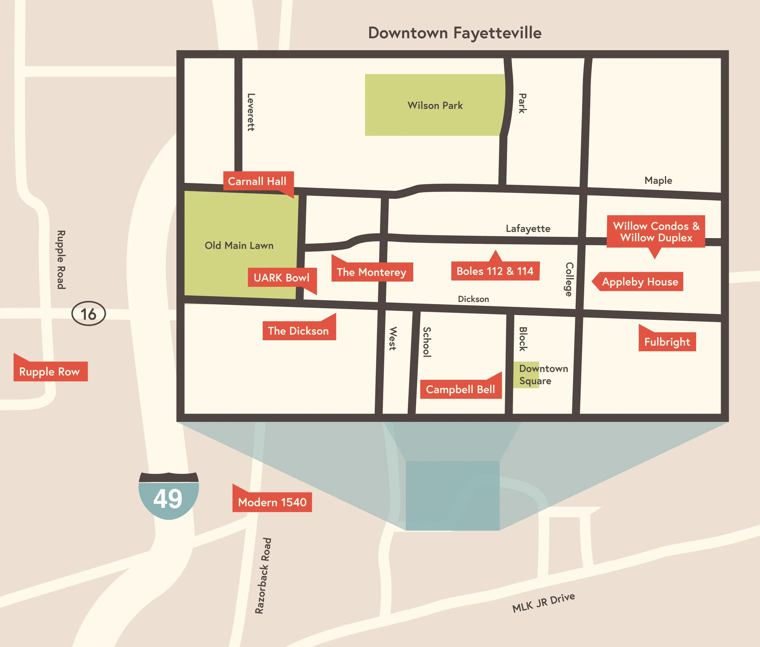 Old Buildings LLC is on a mission to preserve and celebrate Fayetteville’s unique charm by revitalizing old buildings so these sites can once again benefit our amazing community. We own and manage several commercial and residential properties in town - The Dickson, The Leroy Lounge, The Monterey Condos, Modern1540 Apartments, and Willow Condos (the former historic St. Joseph Church) just to name a few.